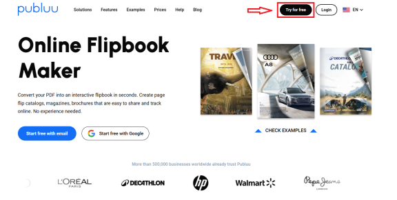 Head over to the TRY FOR FREE button in the top right-hand corner of the Publuu home page.